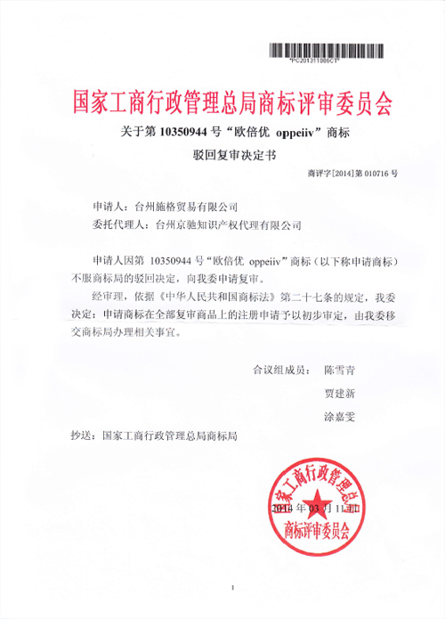 “歐倍優(yōu)OPPEIIV”商標(biāo)駁回復(fù)審裁定書