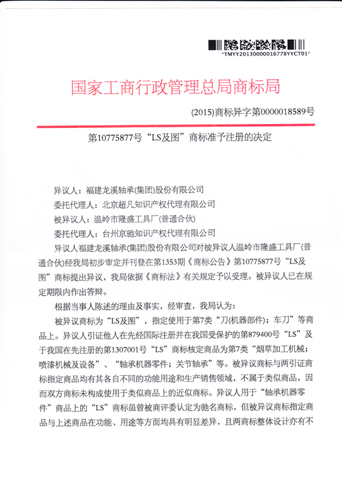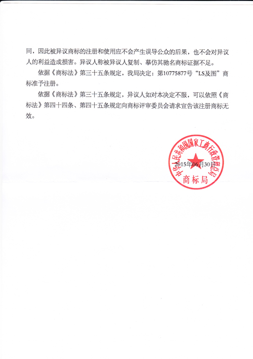 “LS及圖”商標準予注冊的決定