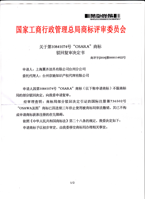 “OSARA”商標(biāo)駁回復(fù)審決定書