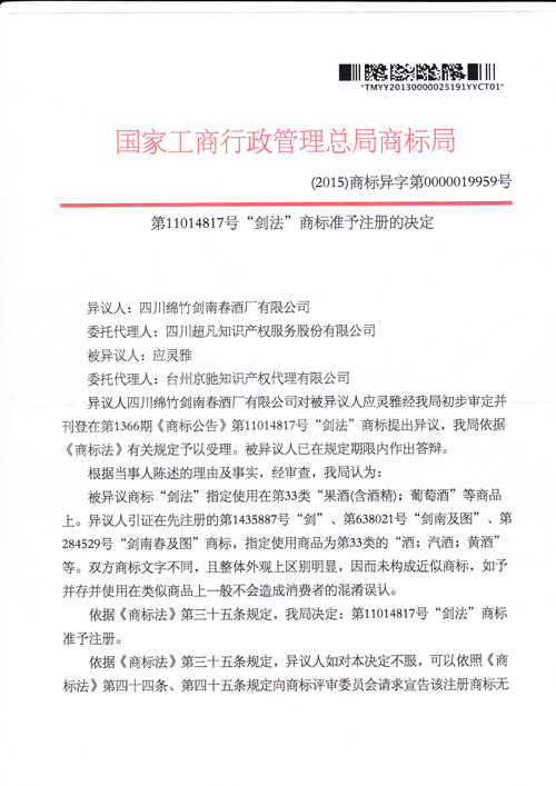 “劍法”商標(biāo)準(zhǔn)予注冊(cè)的決定