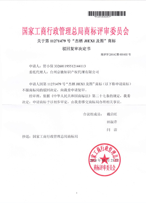 “杰棲JIEXI及圖”商標駁回復審決定書