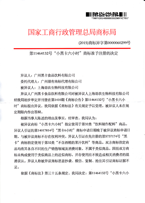 “小黑卡六小時”商標(biāo)準(zhǔn)予注冊的決定