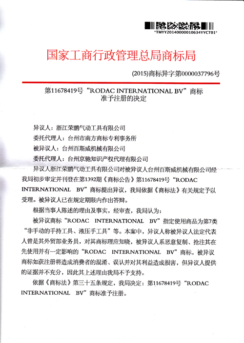“RODAC INTERNATIONAL BV”商標準予注冊的決定