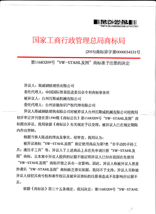 “SW-STAHL及圖”商標(biāo)準(zhǔn)予注冊(cè)的決定