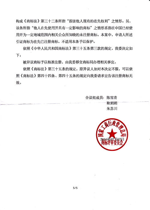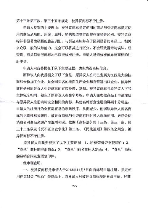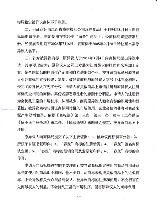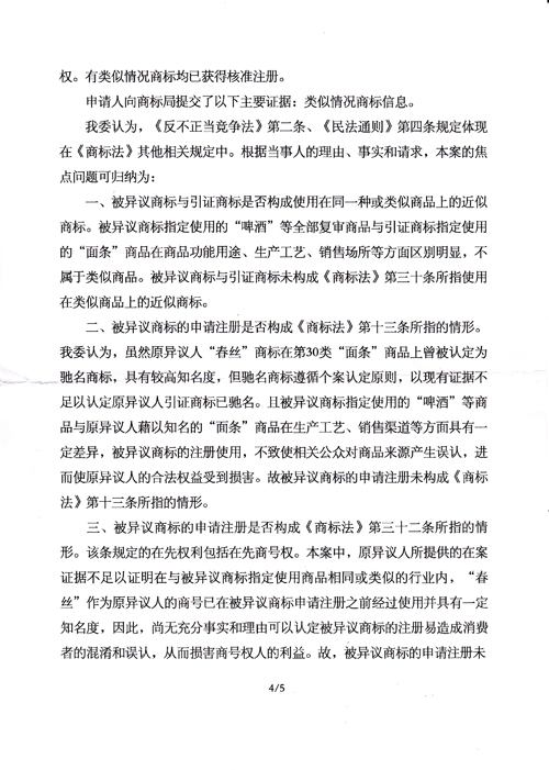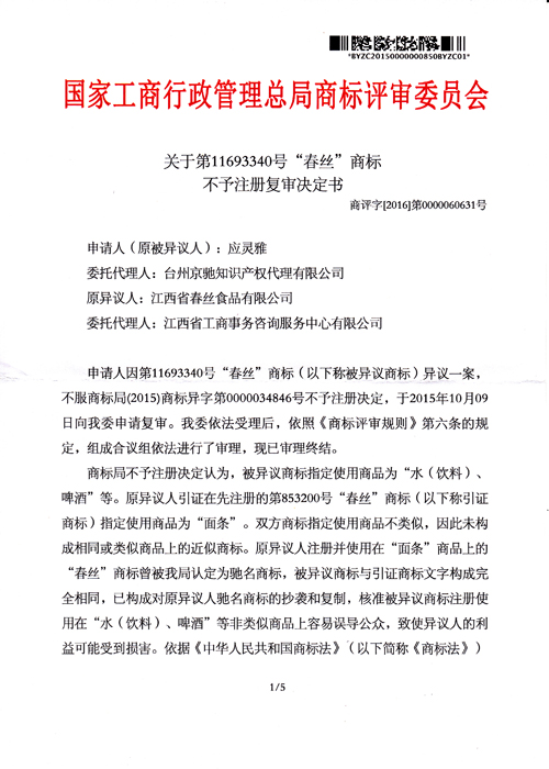 “春絲”商標(biāo)不予注冊(cè)復(fù)審決定書(shū)