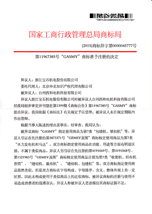 “GASMY”商標(biāo)準(zhǔn)予注冊(cè)的決定