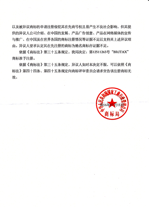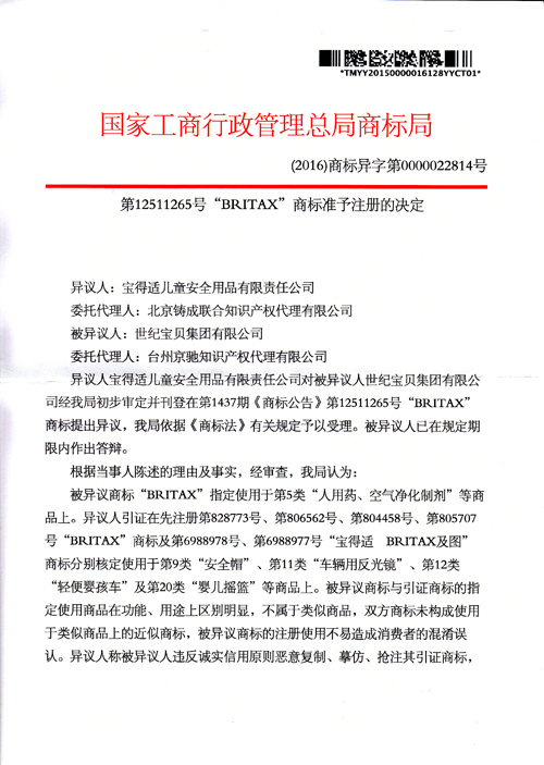 “BRITAX”商標(biāo)準(zhǔn)予注冊(cè)的決定