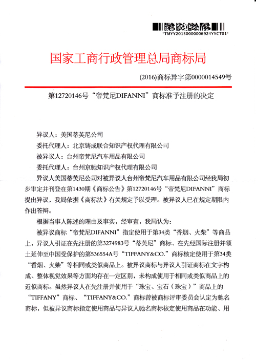 “蒂凡尼DIFANNI”商標(biāo)準(zhǔn)予注冊的決定