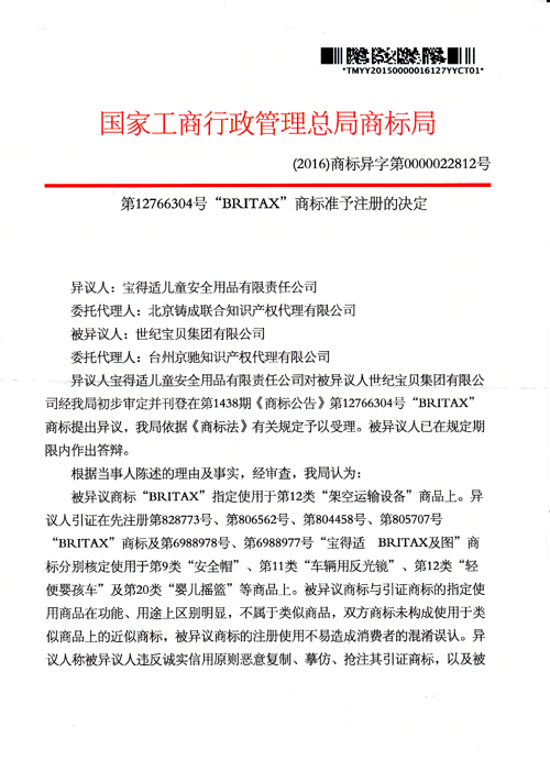 “BRITAX”商標(biāo)準(zhǔn)予注冊的決定