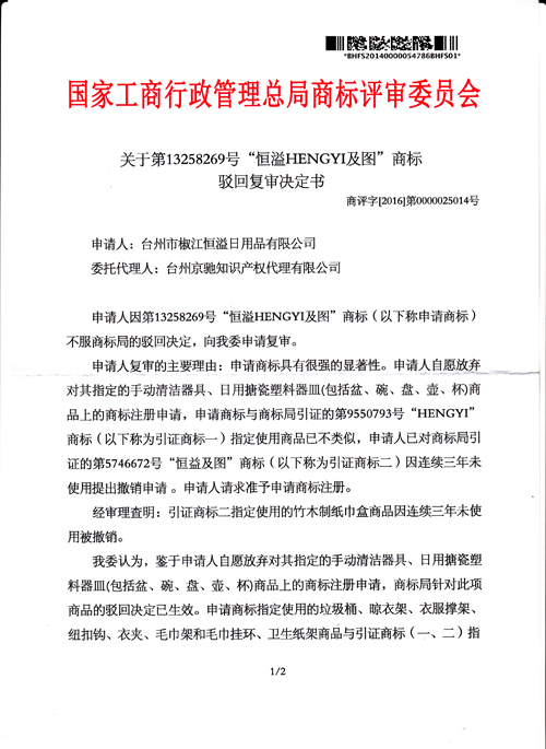 “恒溢HENGYI及圖”商標駁回復審決定書