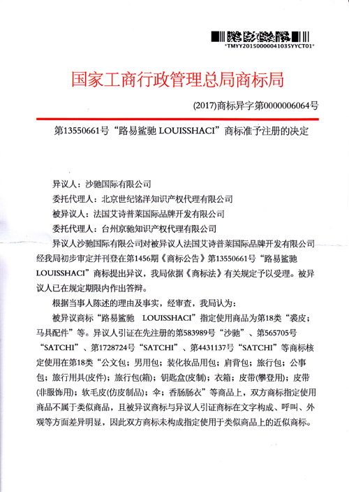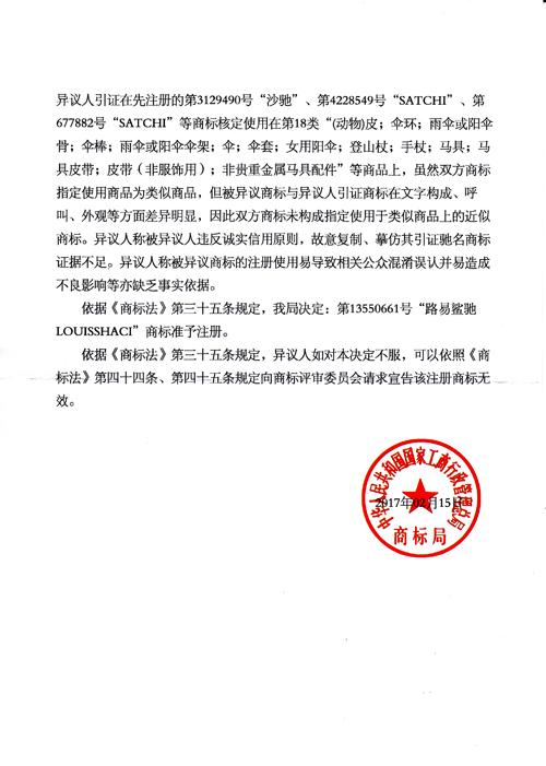 “路易鯊馳LOUISSHACI”商標(biāo)準(zhǔn)予注冊(cè)的決定