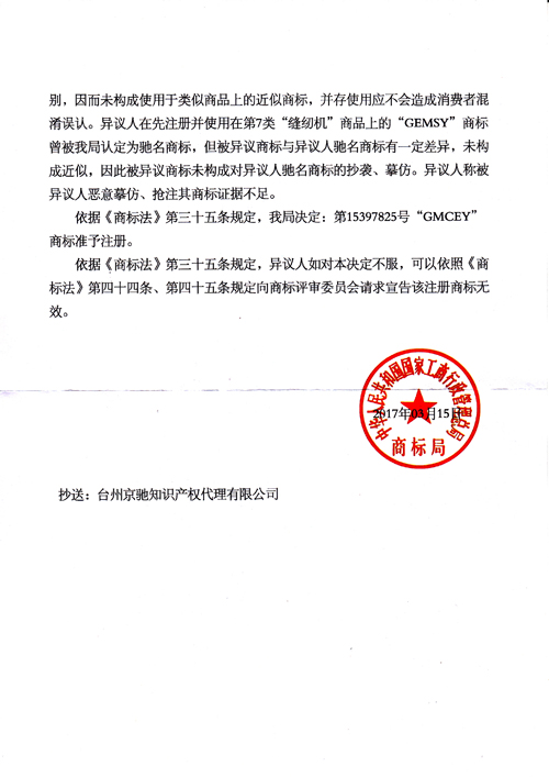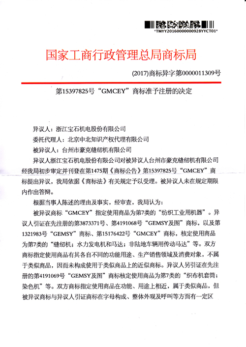 “GMCEY”商標(biāo)準(zhǔn)予注冊(cè)的決定