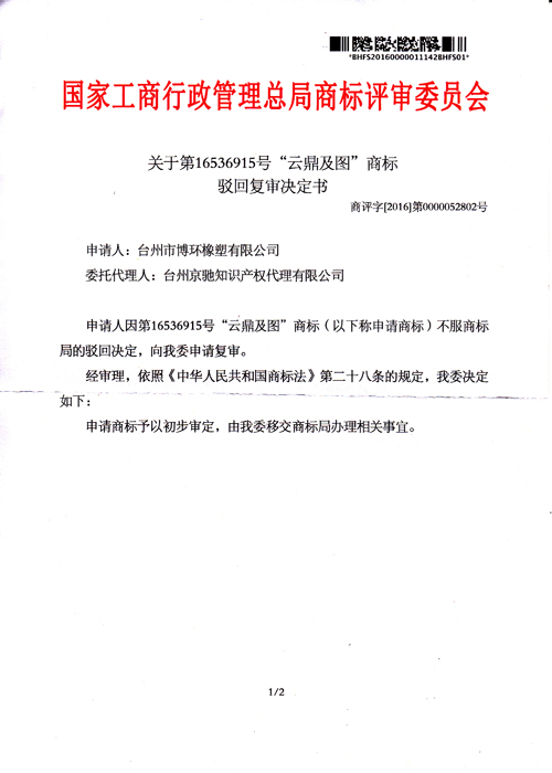 “云鼎及圖”商標駁回復審決定書