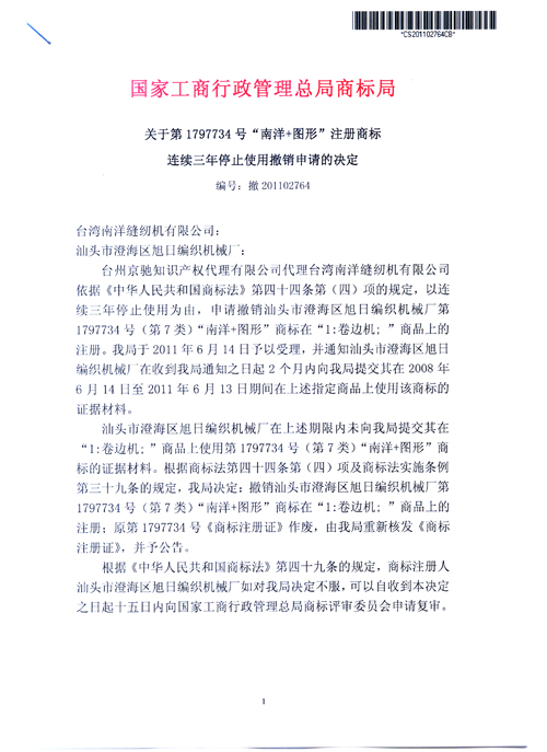 “南洋+圖形”注冊商標連續三年停止使用撤銷申請的決定