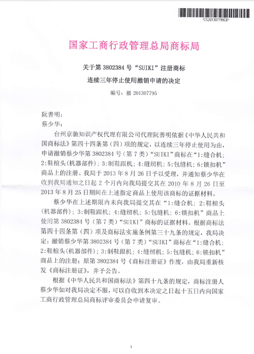 “SUIKI”注冊(cè)商標(biāo)連續(xù)三年停止使用撤銷申請(qǐng)的決定