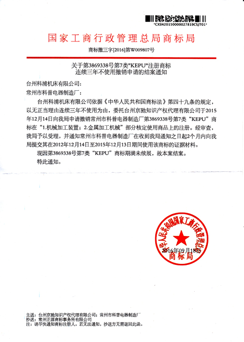 “KEPU”注冊商標連續三年不使用撤銷申請的結案通知