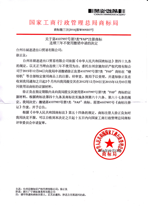 “FAF”注冊商標連續三年不使用撤銷申請的決定