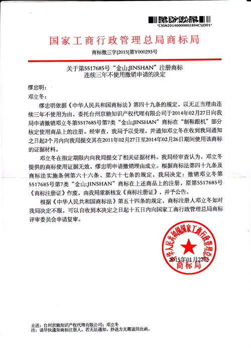 “金山JINGSHAN”注冊商標連續三年不使用撤銷申請的決定