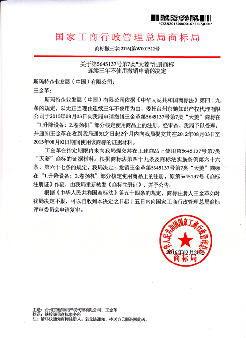 “天菱”注冊商標連續三年不使用撤銷申請的決定