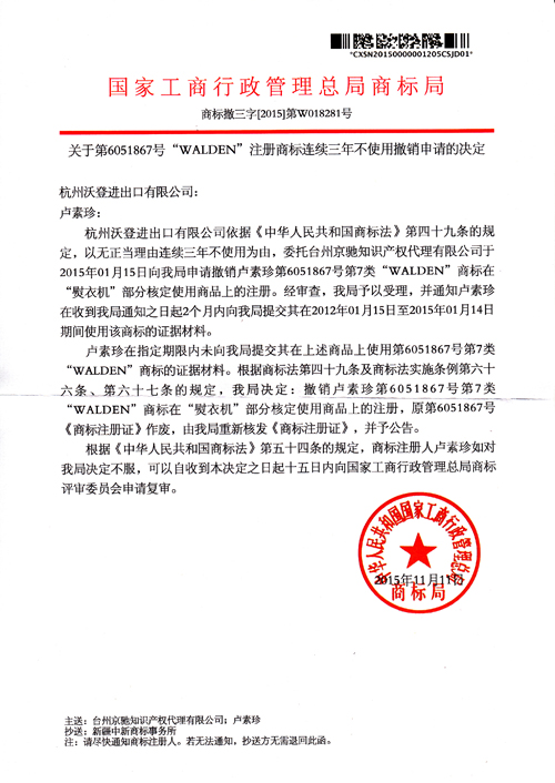 “WALDEN”注冊商標連續三年不使用撤銷申請的決定