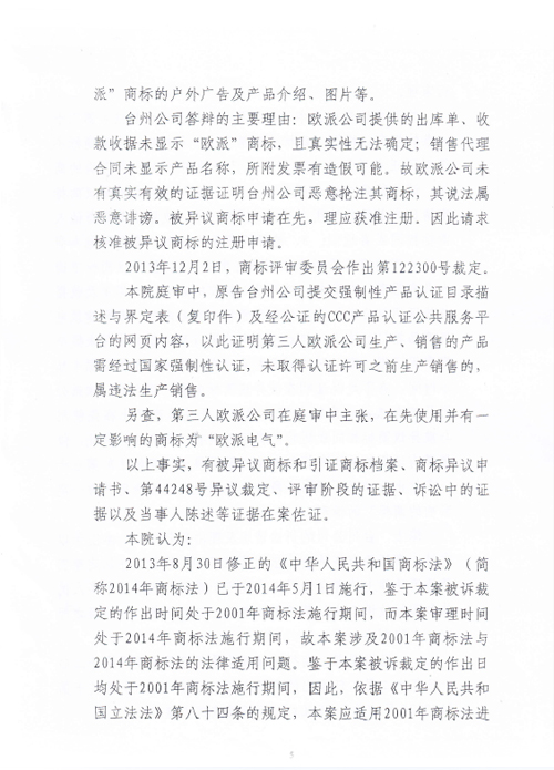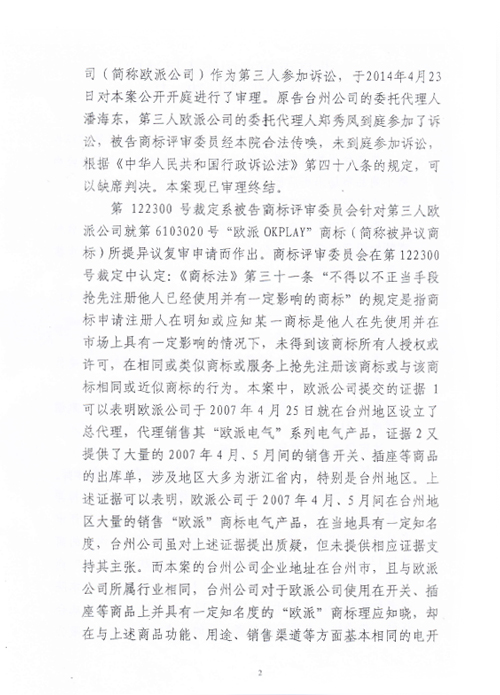 “歐派OKPLAY”商標(biāo)行政訴訟判決書