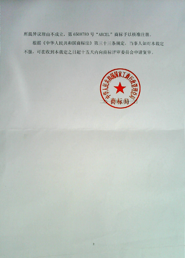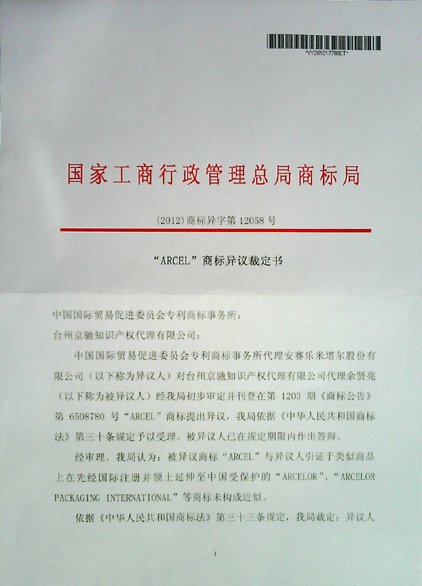 “ARCEL”商標(biāo)異議裁定書