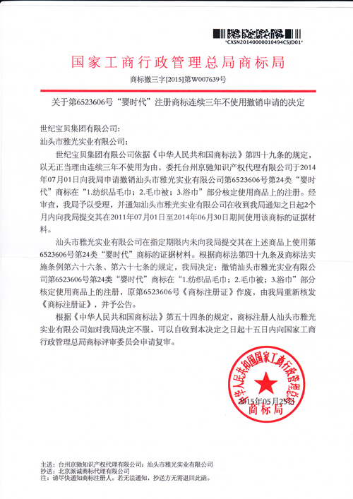 “嬰時代”注冊商標連續三年不使用撤銷申請的決定