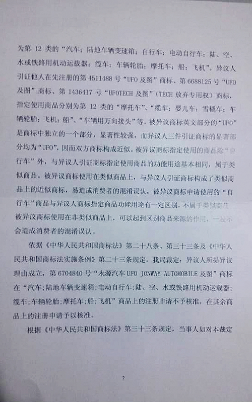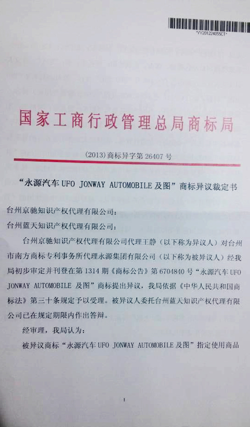 “永源汽車UFO JONWAY AUTOMOBILE及圖”商標異議裁定書