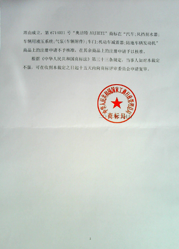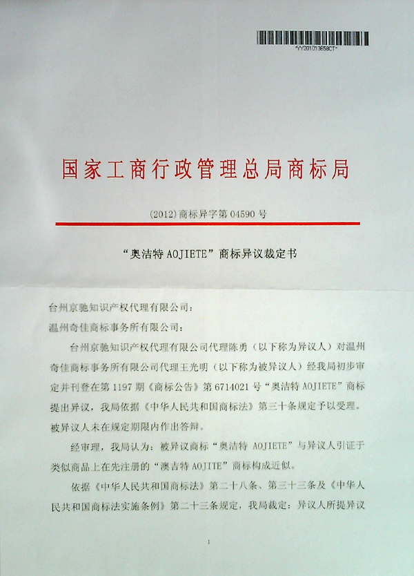 “奧潔特AOJIETE”商標異議裁定書