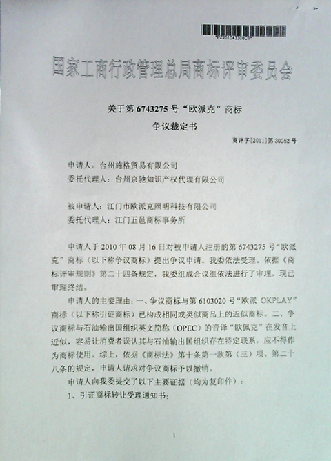 “歐派克”商標爭議裁定書