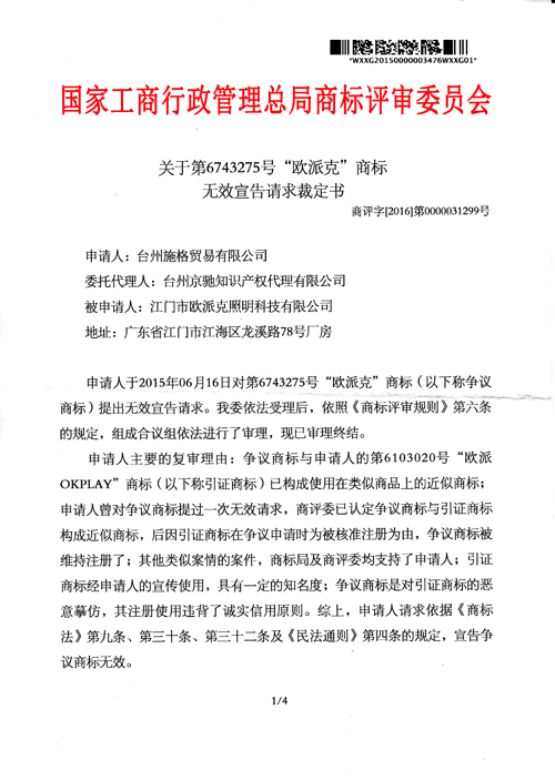 “歐派克”商標無效宣告請求裁定書