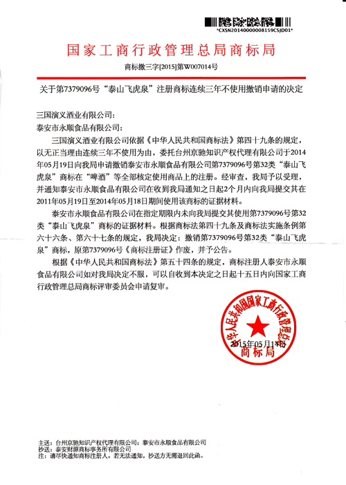 “泰山飛虎泉”注冊(cè)商標(biāo)連續(xù)三年不使用撤銷申請(qǐng)的決定