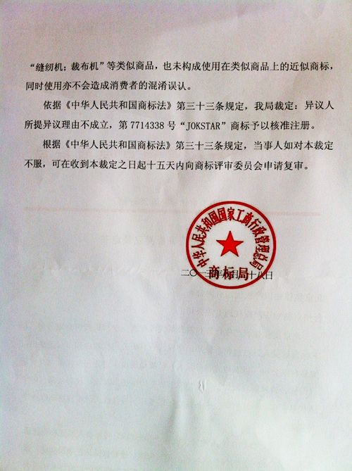 “JOKSTAR”商標異議裁定書
