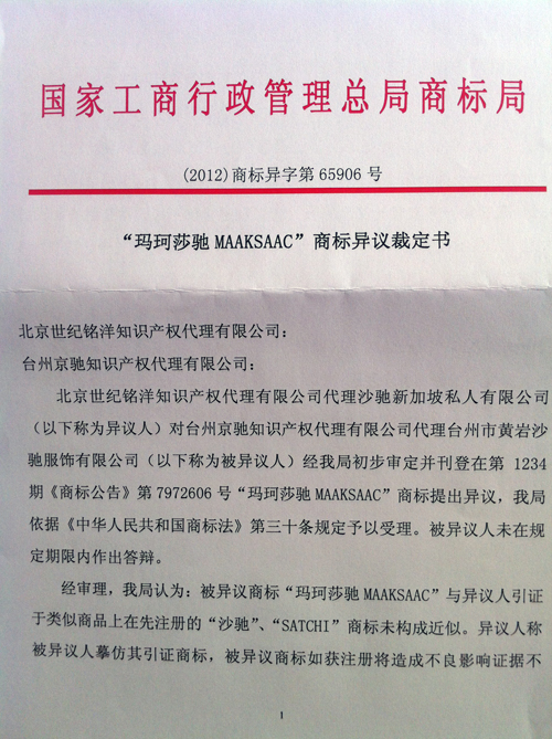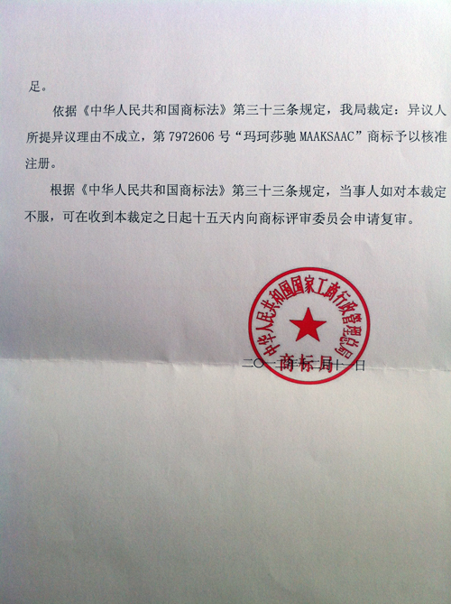 “瑪珂莎馳MAAKSAAC”商標異議裁定書