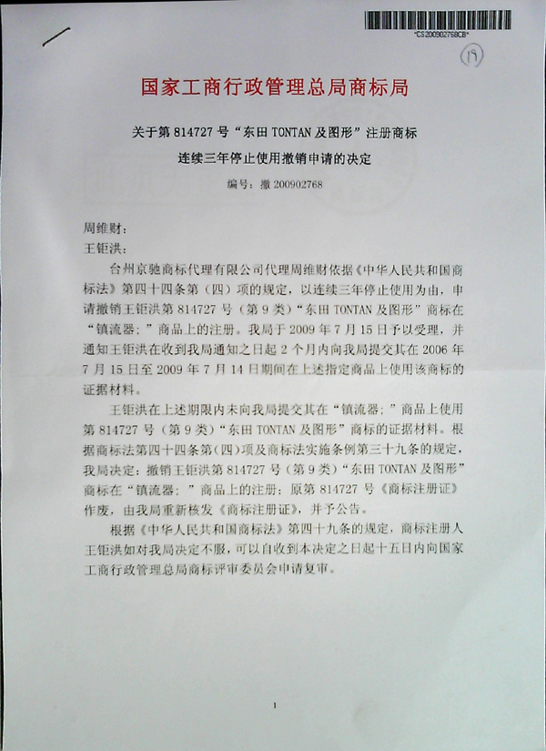 “東田TONTAN及圖形”注冊商標連續三年停止使用撤銷申請的決定書