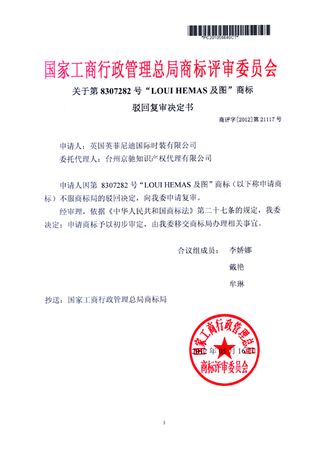 “LOUI HEMAS及圖”商標駁回復審決定書