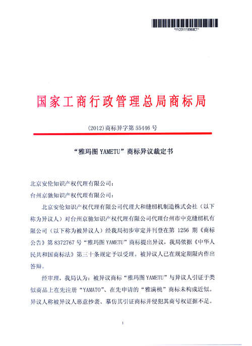 “雅瑪圖YAMETU”商標(biāo)異議裁定書