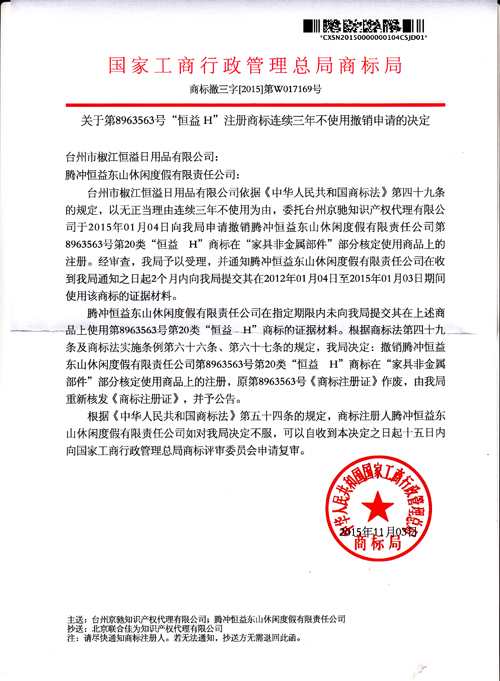“恒益H”注冊商標連續三年不使用撤銷申請的決定