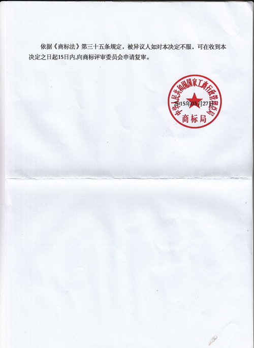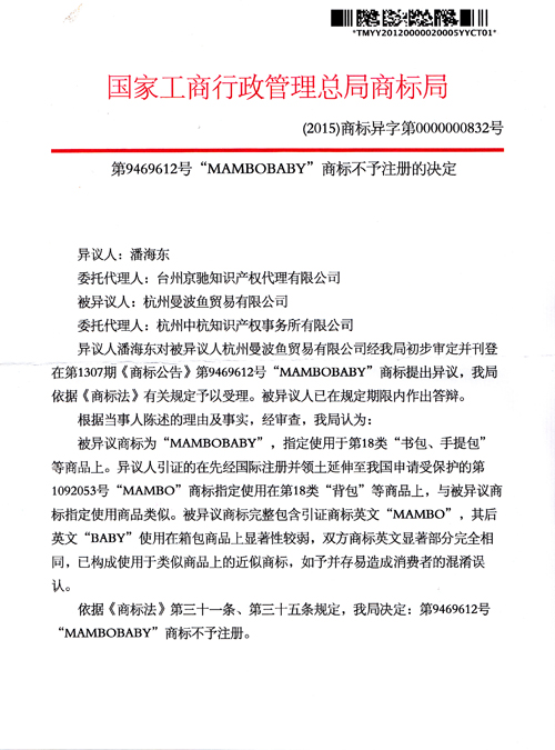 “MAMBOBABY”商標不予注冊的決定