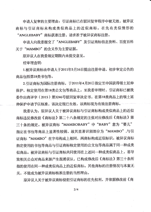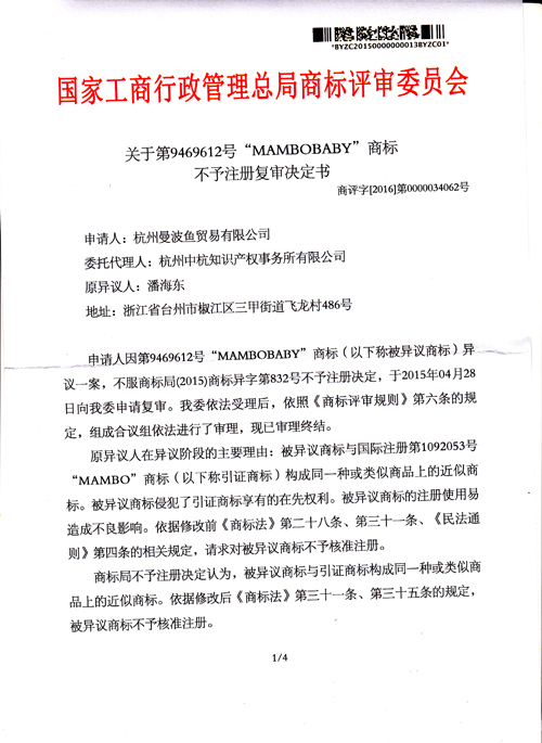 “MAMBOBABY”商標(biāo)不予注冊(cè)復(fù)審決定書