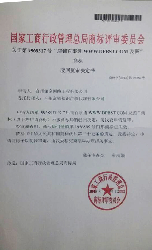 “店鋪百事通WWW.DPBST.COM及圖”商標駁回復審決定書