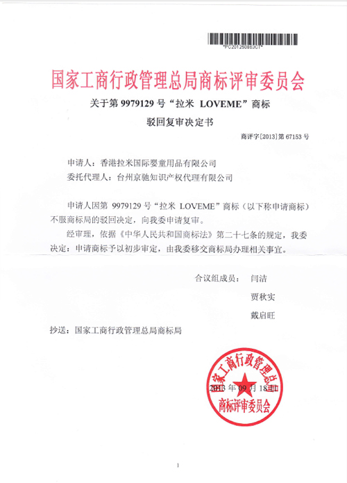 “拉米LOVEME”商標(biāo)駁回復(fù)審決定書