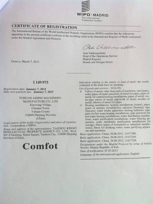 COMFOT馬德里注冊(cè)證書(shū)